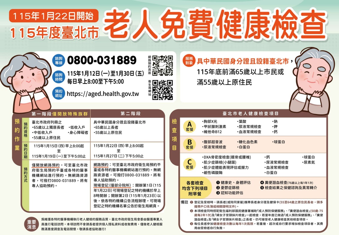 國健署四項癌症篩檢 ( 乳癌、大腸癌、口腔癌、子宮頸癌 )、BC肝檢查、老人體檢、成人預防保健服務。名額有限,受檢資格及項目請參閱相關說明。