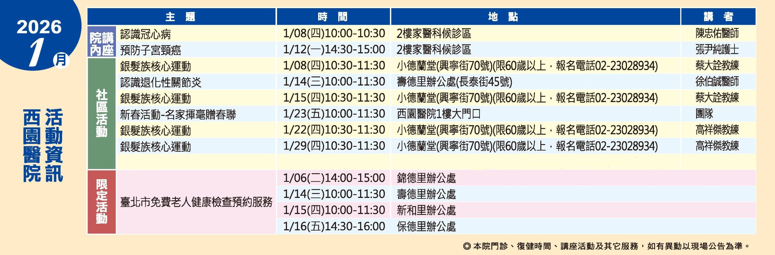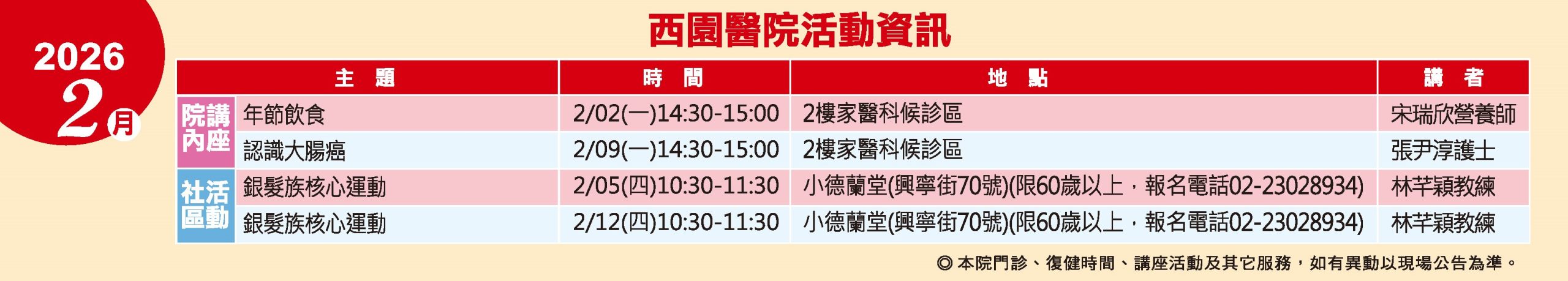 歡迎參加我們的健康講座活動,西園醫院關心您的健康,每月定期規劃一系列課程,包括院內健康講座、社區健康活動,更多活動訊息,歡迎洽詢衛教室及社區醫學科 (02)2307-6968 #2007。