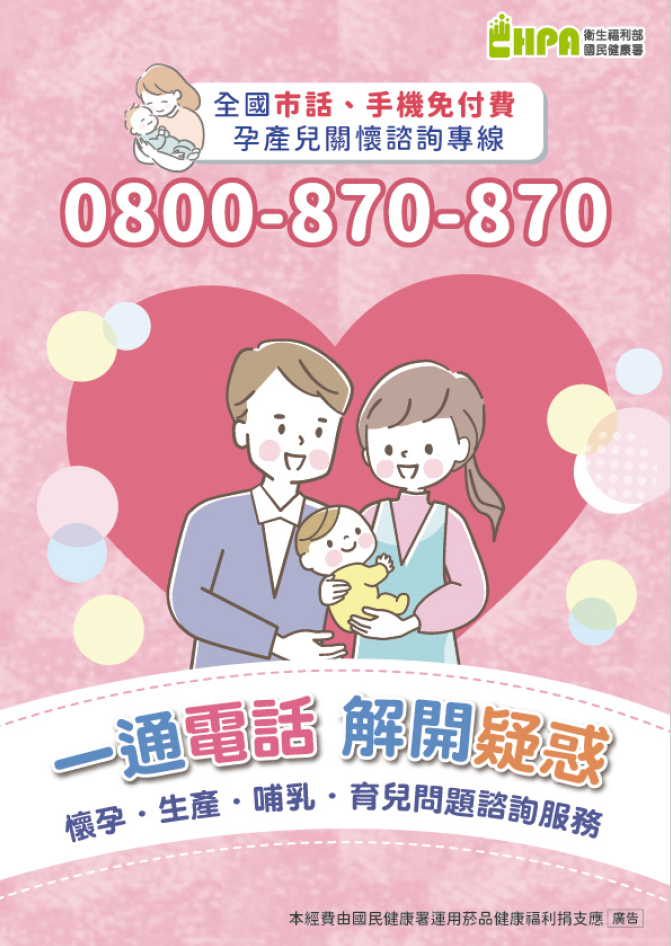 衛生福利部國民健康署-孕產兒關懷專線0800-870870. 提供諮詢服務議題,包括:產前、產後親子健康;母乳哺育指導;孕前、孕期、產後營養與體重管理、身心調適…等議題之保健諮詢、傾聽、關懷及支持與必要的資源轉介服務,幫助新手爸媽及其家人早日順利上手。