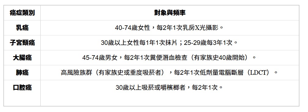 林智文提醒,癌症不可怕,可怕的是忽略了能拯救生命的篩檢。目前政府提供以下5大癌症免費篩檢,呼籲符合以下資格的民眾應定期受檢: