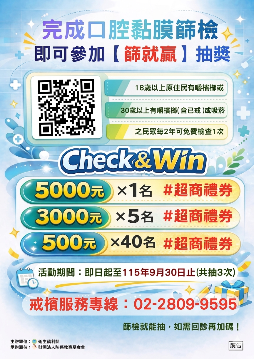 為推動高嚼檳職場檳榔防制工作及營造無檳文化,本部委託財團法人防癌教育基金會辦理115年度「Check & Win 篩就贏活動」,活動期間自即日起至115年9月30日止,凡18歲以上原住民或30歲以上民眾符合有吸菸或嚼檳榔之行為,完成本部預防保健服務口篩者,掃描活動QR code線上填寫基本資料及完成「檳榔健康危害暨宣導意見調查問卷」後即可參加抽獎,活動將於6月、8月及10月抽出幸運得主,每次抽獎獎勵為超商禮券:5,000元1位、3,000元5位、500元40位),另後續依醫師建議完成回診追蹤檢查,衛生福利部將於口腔癌篩檢系統篩選名單,於10月出「追蹤獎」(超商禮券500元30位);活動詳細說明如附件。